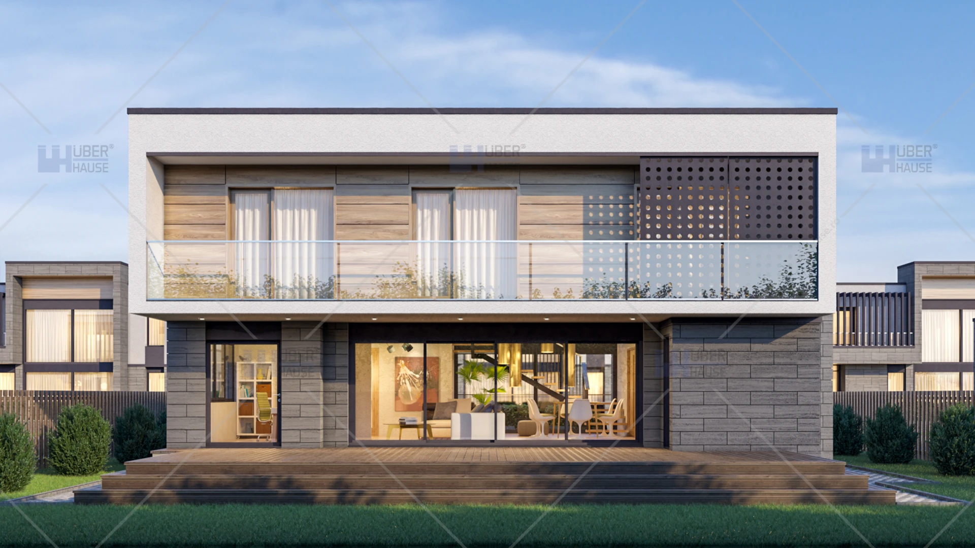 Cu o suprafață construită desfășurată de 240 mp, din care 185 mp utili, Rivena este o casa cu aspect contemporan, având la parter living + dining, bucătărie, birou, baie, grup sanitar, două terase, cameră tehnică și spațiu pentru depozitare. La etaj sunt prevăzute trei dormitoare, fiecare cu baie și dressing proprii, și trei balcoane. Casa are suprafețe vitrate generoase, iar balconul cel mai mare este prevăzut, pentru umbrire, cu un panou perforat glisant de culoare negru antracit. Structura casei este din cadre de beton armat, acoperișul este de tip terasă, placarea este realizată cu piatră naturală din travertin de culoare gri și cu panouri de lemn tratat pentru exterior.